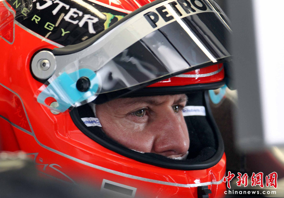 4月16日,2010國際汽聯F1世界錦標賽上海站在上海國際賽車場開始車手第一、第二次練習賽。圖為代表梅賽德斯GP車隊出戰的老車王、德國車手舒馬赫重回上海賽道。 中新社記者 任晨鳴 攝