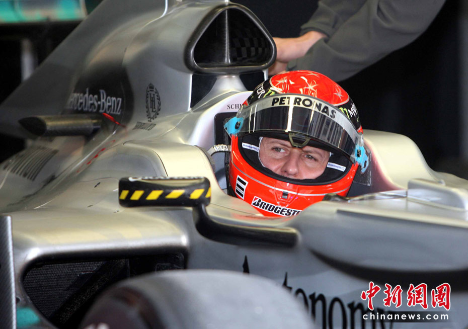 4月16日,2010國際汽聯(lián)F1世界錦標(biāo)賽上海站在上海國際賽車場(chǎng)開始車手第一、第二次練習(xí)賽。圖為代表梅賽德斯GP車隊(duì)出戰(zhàn)的老車王、德國車手舒馬赫重回上海賽道。 中新社記者 任晨鳴 攝
