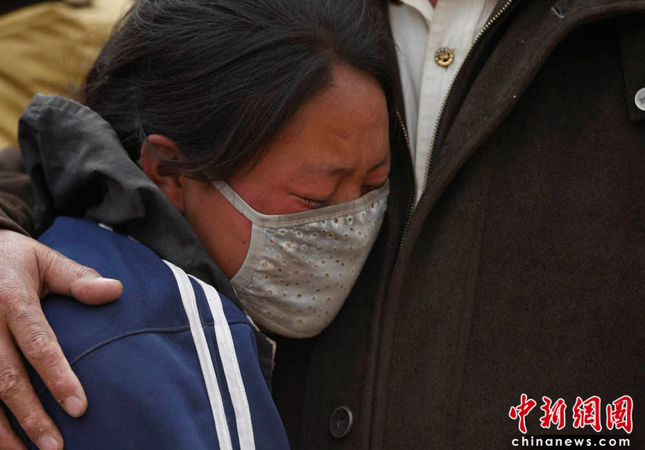 2010年4月16日,青海玉樹藏族自治州玉樹縣結古鎮一所中學的震災救援現場,痛失孩子的母親淚流不止。中新社發 盛佳鵬 攝