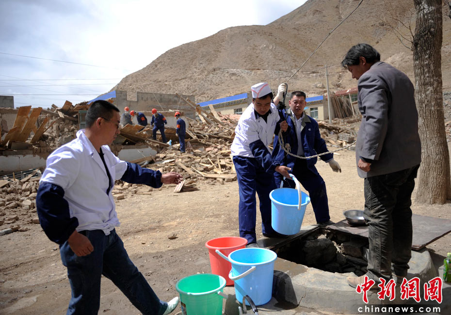 4月16日,青海玉樹民族綜合職業學校生活保障人員提取地下水飲用。中新社發 廖攀 攝