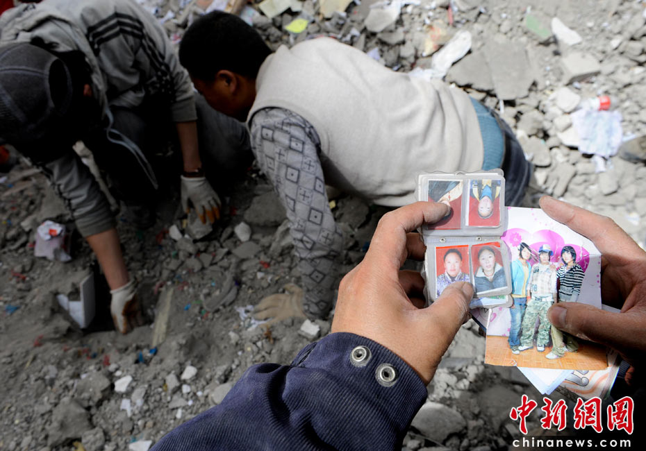 4月16日,青海玉樹民族師范學校內,玉樹州教育局官員扎西手持學生照片焦急等待現場救援進展。中新社發 廖攀 攝