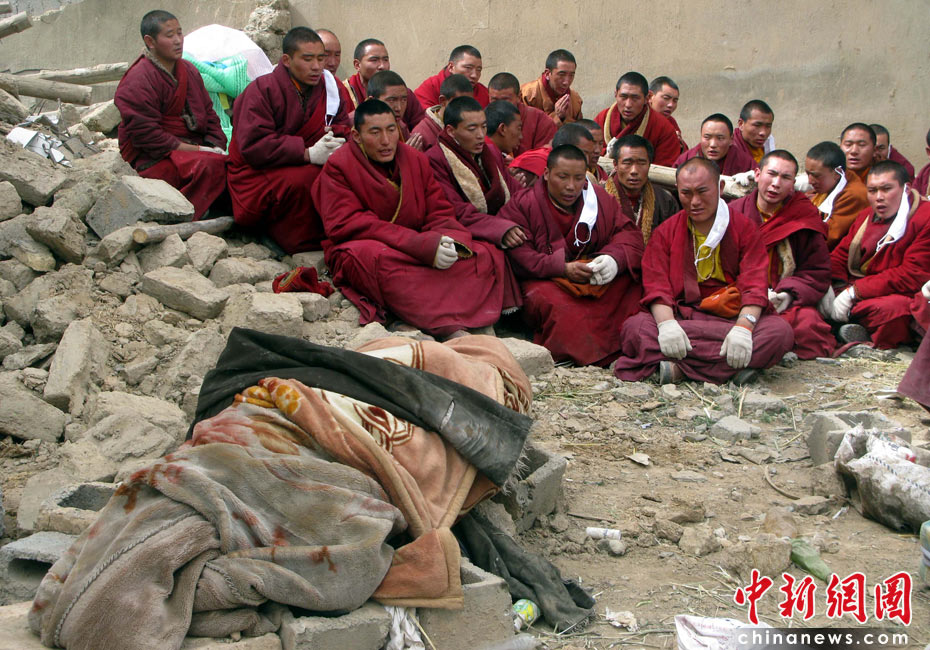 4月16日,青海玉樹震區(qū)僧侶們在廢墟邊為地震遇難者按藏族習(xí)俗進行超度。中新社發(fā) 孫自法 攝