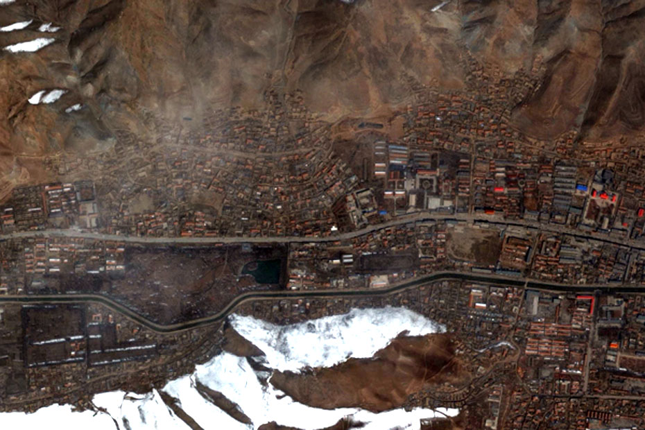 利用對地觀測中心2010年4月16日獲取的高分辨率航空遙感數(shù)據(jù),提取出玉樹州結(jié)古鎮(zhèn)城區(qū)范圍內(nèi)地震破壞最嚴(yán)重或典型地區(qū),使之與GoogleEarth中相應(yīng)位置的震前遙感衛(wèi)星數(shù)據(jù)進(jìn)行對比,直觀展現(xiàn)結(jié)古鎮(zhèn)在此次地震中的受影響程度。圖片來源:中國科學(xué)院