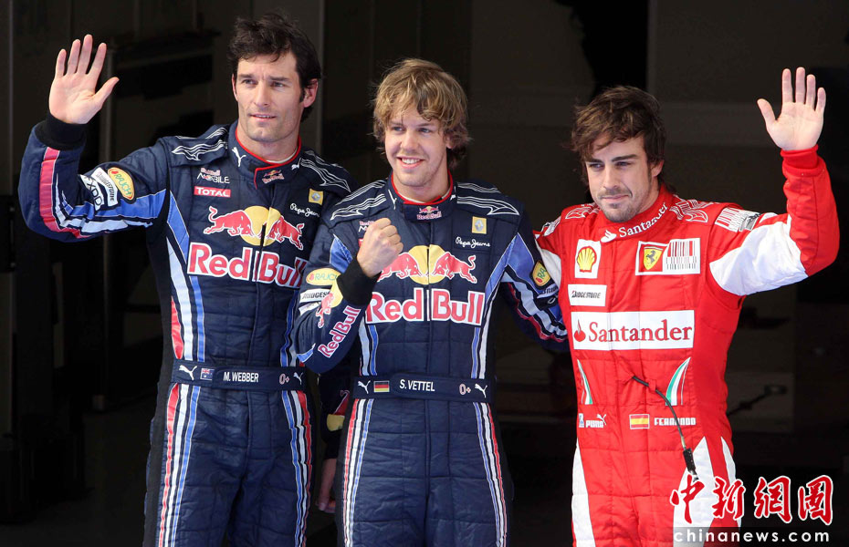4月17日下午,2010國際汽聯F1世界錦標賽上海站在上海國際賽車場舉行排位賽,代表紅牛車隊出戰的德國車手維特爾(中)獲得桿位,隊友、澳大利亞車手韋伯(左)獲得第二名,法拉利車隊的西班牙車手阿隆索獲得第三名。中新社記者 任晨鳴 攝