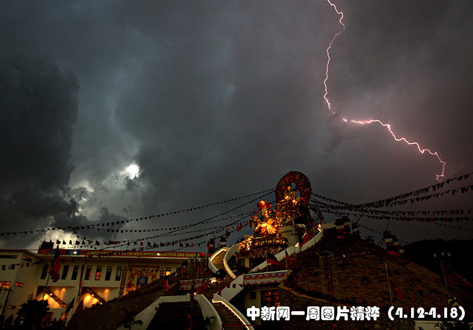 4月14日周三在尼泊爾加德滿都郊區,一座舍利塔附近電閃雷鳴,這座佛塔內供奉著佛祖舍利。