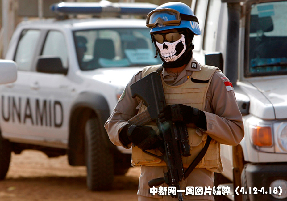 4月13日周二,在蘇丹法希爾郊區(qū)的一處難民營,一名聯(lián)合國駐蘇丹達(dá)爾富爾維和人員正在站崗。官方表示,四名維和人員不久前在這一地區(qū)失蹤。