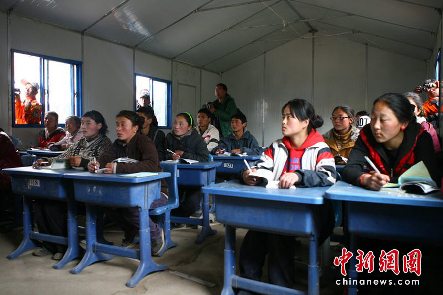4月18日,70多名孩子在地震四天后重新走進了課堂,玉樹州孤兒學校成為了地震災區第一所復課的學校,剛完成帳篷搭建的青海省玉樹藏族自治州第一民族中學3個年級的學生也開始復課。青友 攝