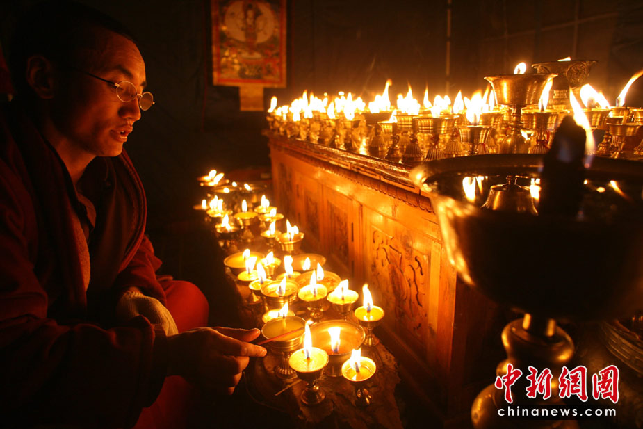 4月18日晚,玉樹僧人為地震遇難者供燈。當日,民眾自發在結古鎮格薩爾王廣場舉行酥油燈法會,悼念地震遇難者。中新社發 蘇丹 攝