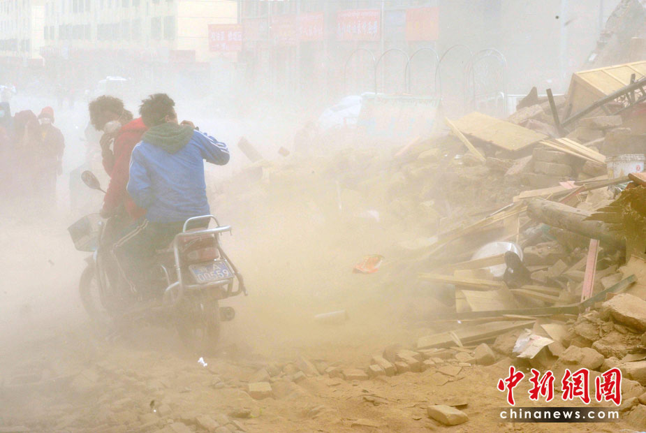 4月中旬青海玉樹地震災區風沙迷漫,結古鎮受災民眾在風塵滾滾中艱難出行。中新社發 賈國榮 攝