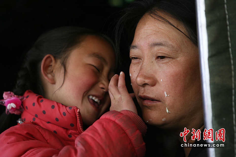 4月20日,青海省玉樹縣結古鎮紅旗小學一年級學生羅菁瑜在臨時帳篷里為媽媽涂雪花膏。他的爸爸出門到家中倒塌的廢墟里去尋找衣服等可用的物品。中新社發 蘇丹 攝