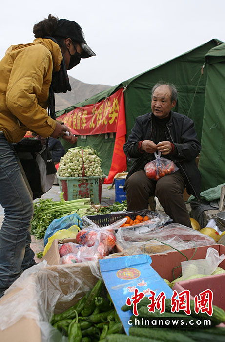 4月20日,青海省玉樹縣結古鎮一位商販在帳篷區賣新鮮蔬菜。震后玉樹逐步恢復商品供應。中新社發 蘇丹 攝