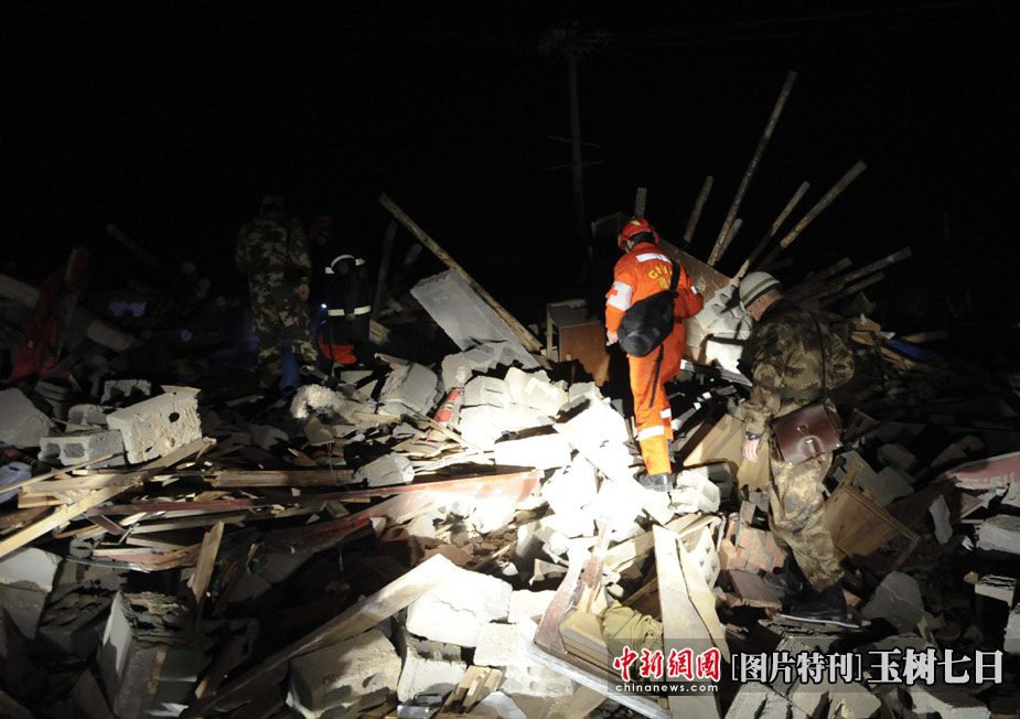 4月15日凌晨1時,武警戰士連夜搜救被困民眾。中新社發 廖攀 攝