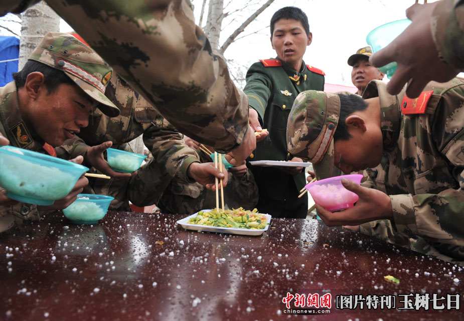 4月20日中午時分,玉樹地震災區突然雷雹交加,正在現場救援的青海武警總隊官兵只能在冰雹中吃午餐。中新社發 賈國榮 攝