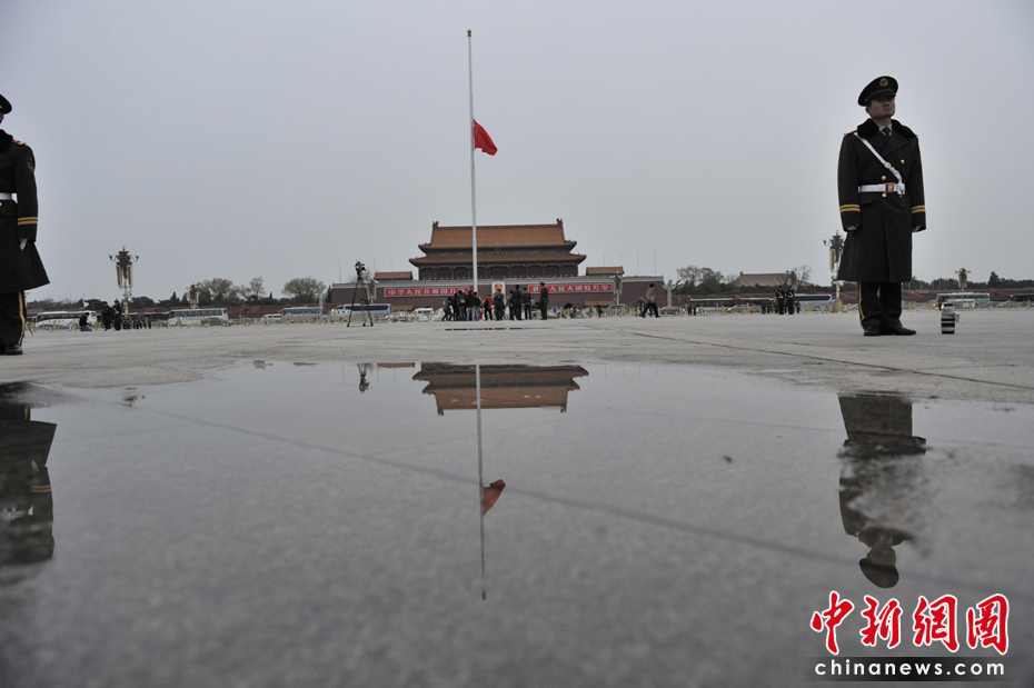 4月21日早晨,北京天安門廣場(chǎng)下半旗向玉樹地震遇難者致哀。中新網(wǎng)記者 金碩 攝