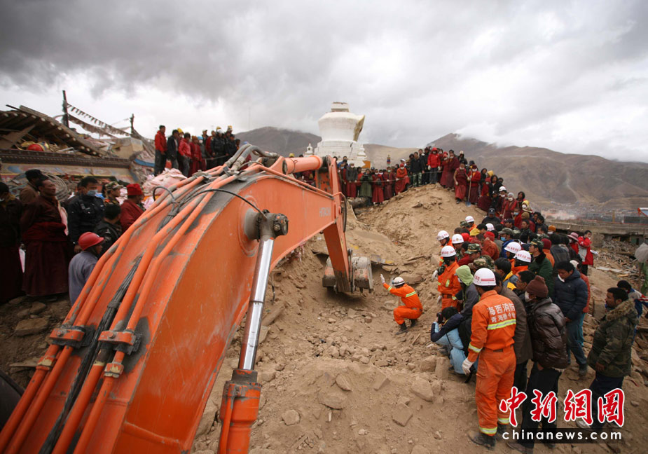 4月20日,玉樹震后第六天,青海消防總隊海西消防救援隊的官兵沒有放棄對幸存者的搜尋,經過7個多小時的努力扎西大同村未發現生命跡象。圖為消防官兵仍未放棄生命搜尋。中新社發 劉忠俊 攝