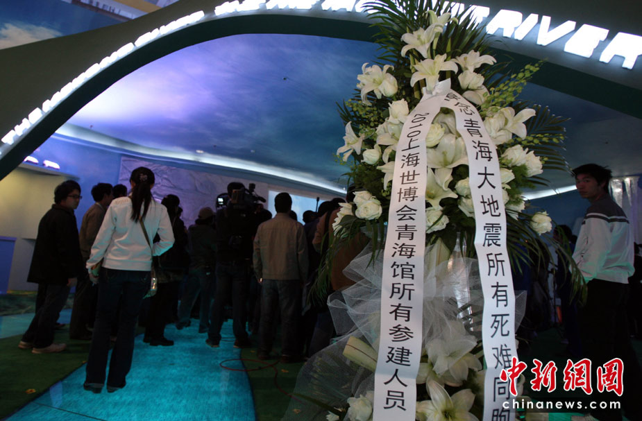 4月21日10點,上海世博青海館舉行儀式哀悼玉樹地震遇難者。當日,全國舉行哀悼活動,深切哀悼青海玉樹地震遇難同胞。中新社發 湯彥俊 攝