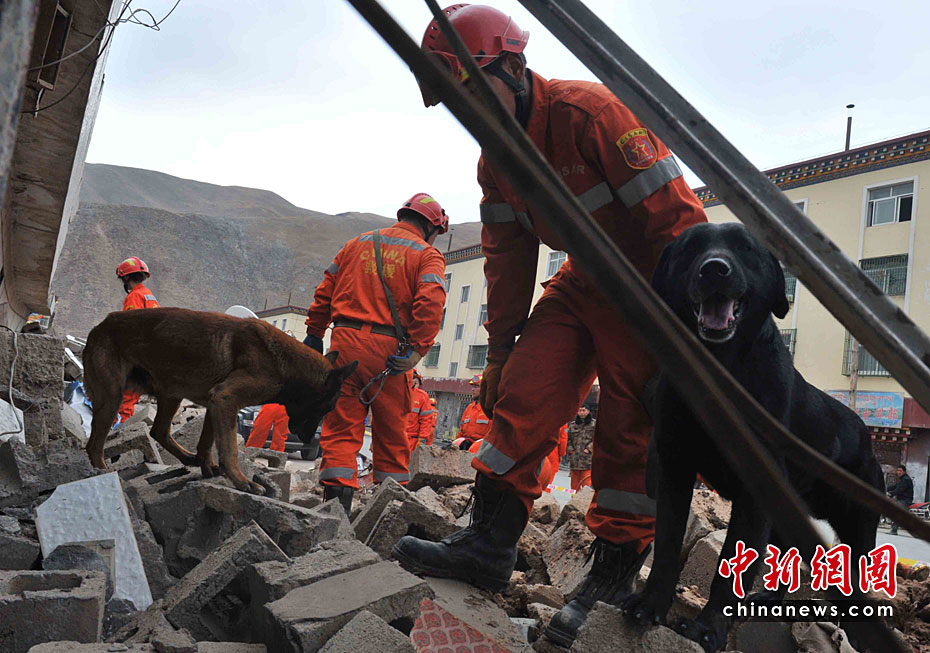 名貴的黑貝犬是中國國家救援隊趕赴青海玉樹地震災區6只搜救犬隊成員之一,身價近百萬元人民幣。4月21日清晨八時許,它在救援隊員的帶領下,到玉樹地震災區中心商業街廢墟里,四處奔波,盡職盡力尋找生命跡象。10時后,他和救援隊員都出現高原反應,暫時休整,準備再戰。賈國榮 攝