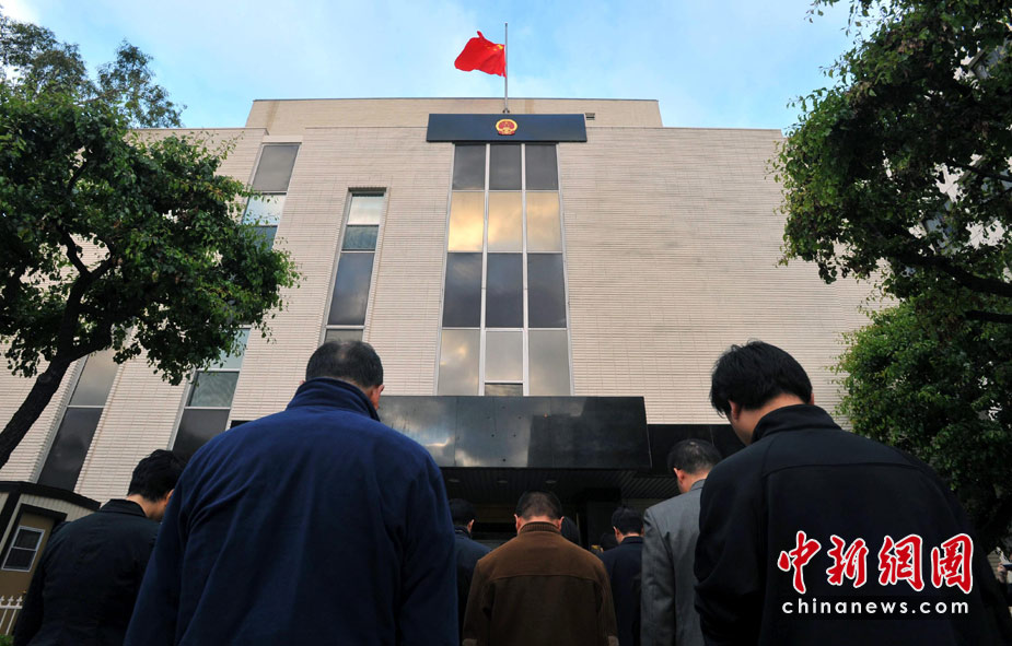 當地時間4月21日清晨,中國駐洛杉磯總領事館在總領館大樓前舉行降半旗儀式,向青海玉樹地震遇難同胞表示深切悼念。中新社發 張煒 攝