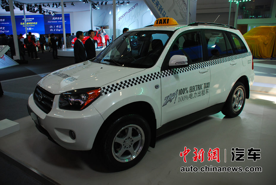 第十一屆北京國(guó)際車展23日開(kāi)幕,在本屆以“暢想綠色未來(lái)”為主題的車展上,新能源車成為最大亮點(diǎn)。圖為永源電動(dòng)出租車 王槊 攝