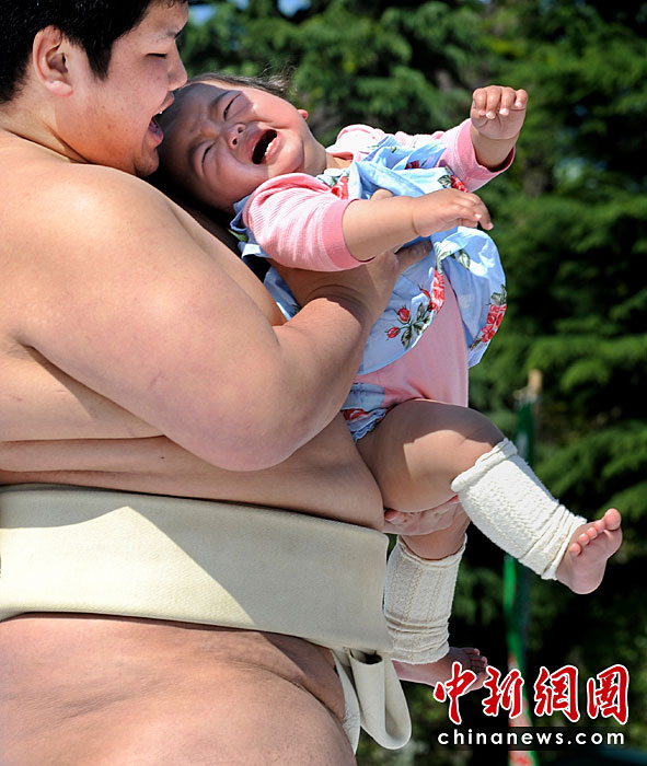 4月25日,日本東京,幾名相撲手手抱嬰兒,正努力使嬰兒哭泣。當日,一年一度的日本一周歲以下嬰兒啼哭大賽在東京淺草寺舉行。第一個讓嬰兒哭泣的選手將贏得比賽,日本通過此種比賽為孩子的健康祈福,他們認為嬰兒哭泣將對他們將來的身體健康有利。圖片來源:中國新聞網
