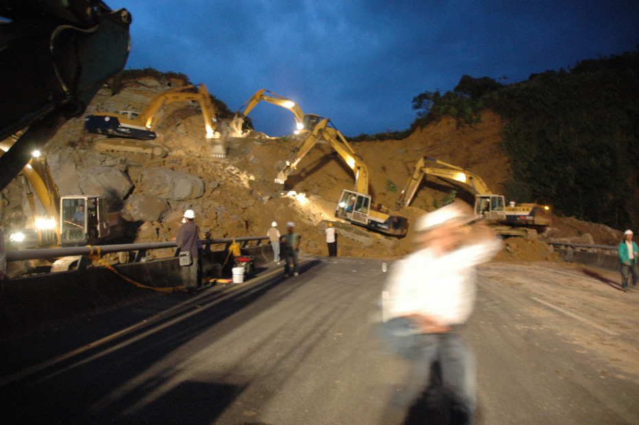 4月25日, 臺(tái)灣一條交通要道、“北二高”基隆段發(fā)生山崩意外,傾瀉而下的土石壓垮一座高架橋,并覆蓋道路約200米,據(jù)傳有人車被埋。圖為工程人員連夜開(kāi)挖,展開(kāi)大搜救。(圖片來(lái)源:“中央社”)。