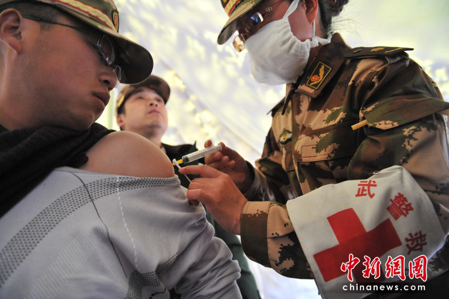 武警青海總隊醫院救護隊半夜為受傷的士兵補打疫苗。4月下旬的玉樹地震災區急缺防疫藥品,中新社發 賈國榮 攝