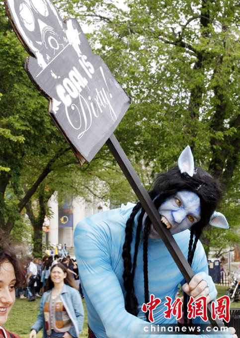 2010年4月25日,在美國首都華盛頓,兩名扮成電影《阿凡達(dá)》里納美人模樣的演員參加“氣候集會”演唱會。當(dāng)天,華盛頓舉行演唱會,紀(jì)念“世界地球日”。4月22日是第41個(gè)“世界地球日”。