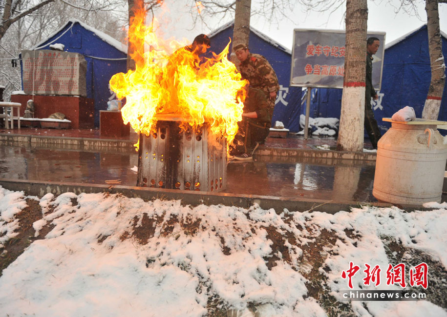 武警青?傟犛駱渲ш犑亲钕韧度肟拐鹁葹牡南蠕h部隊,地震發生時恰逢部隊出操,營房嚴重受損而官兵平安無恙。這里立即成為抗震救災的軍民和媒體的大本營之一,醫療救護隊和新型炊事車晝夜為軍民服務。集結在地震災區的各路部隊從4月低之前全面轉入安置群眾和災后重建,這里的的后勤已經得到基本保障。 圖為武警新型炊事車利用氣化爐冒著雨雪為救援官兵和受災民眾做飯。 中新社記者 賈國榮 攝