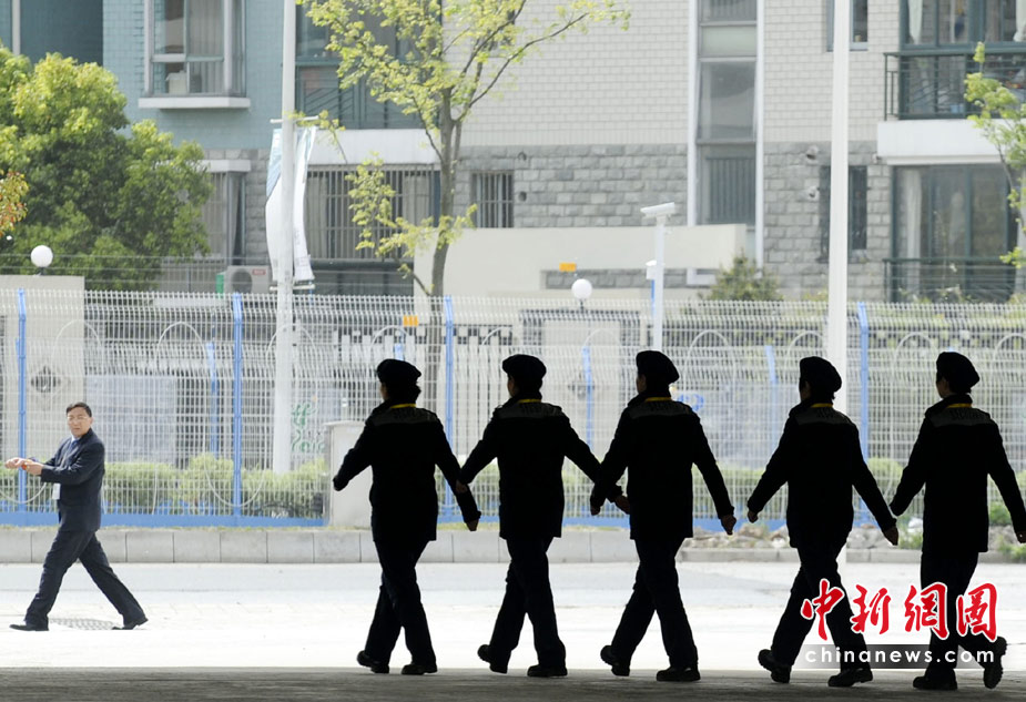 4月27日,上海世博園里一隊女性安保人員走過引起一旁的男士側目。中新社發 廖攀 攝