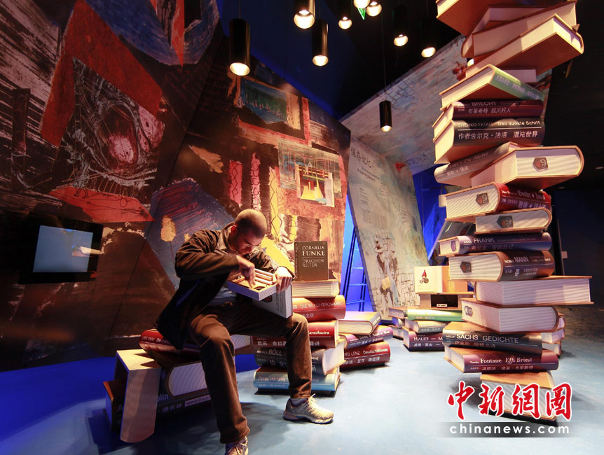 4月27日,上海世博會德國館向媒體記者開放,一名工作人員還在緊張布置書籍堆砌的景觀。中新社發 盛佳鵬 攝