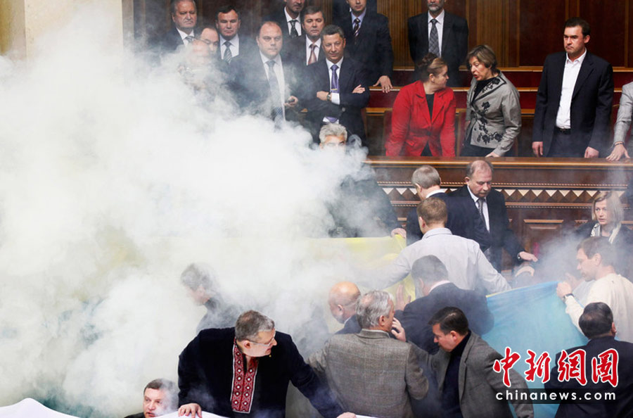 4月27日,基輔,烏克蘭議會就俄羅斯黑海艦隊駐扎問題進行討論時出現混亂,數千人在議會外示威,會場內有人投擲煙霧彈和雞蛋,大廳內煙霧彌漫,場面一度混亂。