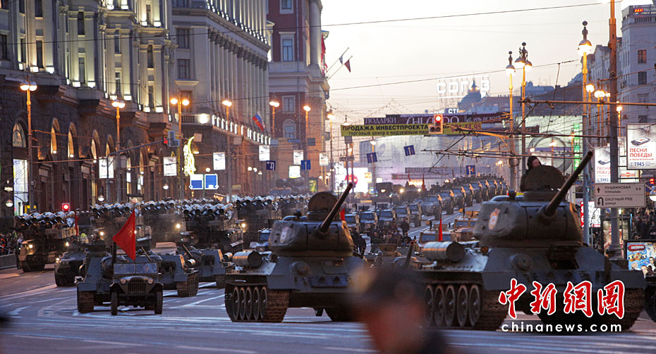 此次紅場(chǎng)閱兵包括兩部分內(nèi)容:歷史部分和現(xiàn)代部分。歷史部分由身穿衛(wèi)國(guó)戰(zhàn)爭(zhēng)時(shí)期軍服的士兵在鵝卵石道上進(jìn)行,同時(shí)還會(huì)有9輛T-34坦克和8輛SU-100自行火炮,F(xiàn)代部分由13輛老虎裝甲車、BTR-80裝甲車、BMP-3步兵戰(zhàn)車、T-90A坦克和S-400防空系統(tǒng)等。圖片來(lái)源:中國(guó)新聞網(wǎng)