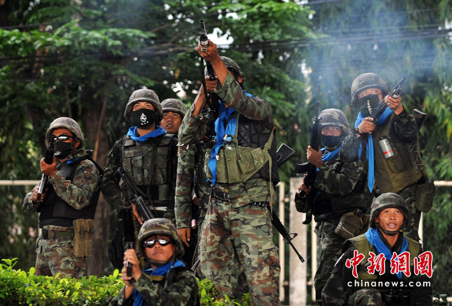 泰國防暴警察與紅衫軍示威民眾28日下午爆發(fā)沖突,1名士兵頭部被擊中身受重傷,10名示威民眾受傷送醫(yī)。