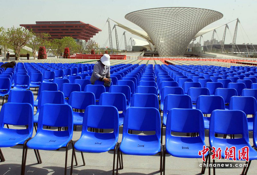 4月29日,上海世博園慶典廣場,一位工作人員正在擦拭開幕式煙花表演的觀眾席座椅。吳煌 攝