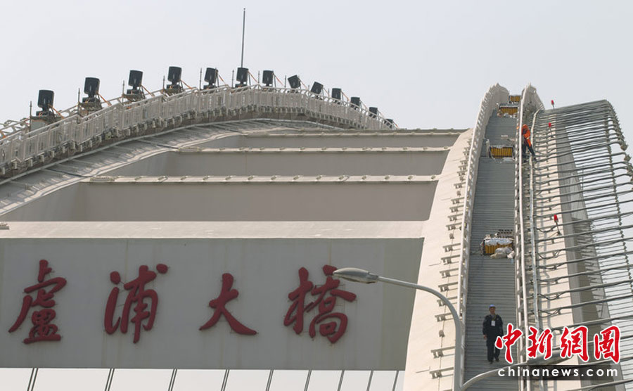 4月30日晚,舉世矚目的上海世博會開幕式將在黃浦江畔世博園區舉行。圖為世博焰火晚會盧浦大橋焰火準備就位。劉行喆 攝