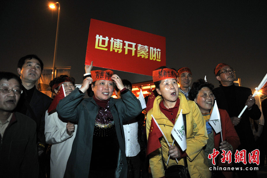 30日晚上8時,2010年上海世博會正式拉開帷幕。上海周家渡動遷居民和志愿者在中國館前打出“世博開幕啦”的大牌子,高喊:“世博開幕啦!我們開心死啦!”中新網記者 王紅綱 攝