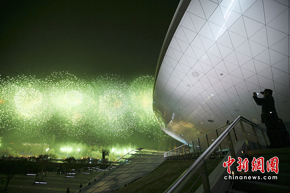 4月30日晚21時28分,在世博會焰火燈光表演開始。萬千煙花爭奇斗妍,黃浦江兩岸綿延3.28公里同時奏響火樹銀花不夜天的華彩世博樂章。圖片來源:中國新聞網
