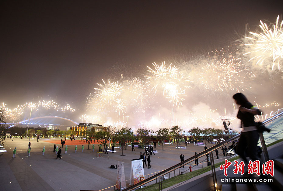 4月30日晚,2010年上海世博會開幕式在上海世博園世博文化中心舉行。21時28分,世博會焰火燈光表演開始。黃浦江兩岸綿延3.28公里同時奏響火樹銀花不夜天的華彩世博樂章。圖片來源:中國新聞網(wǎng)