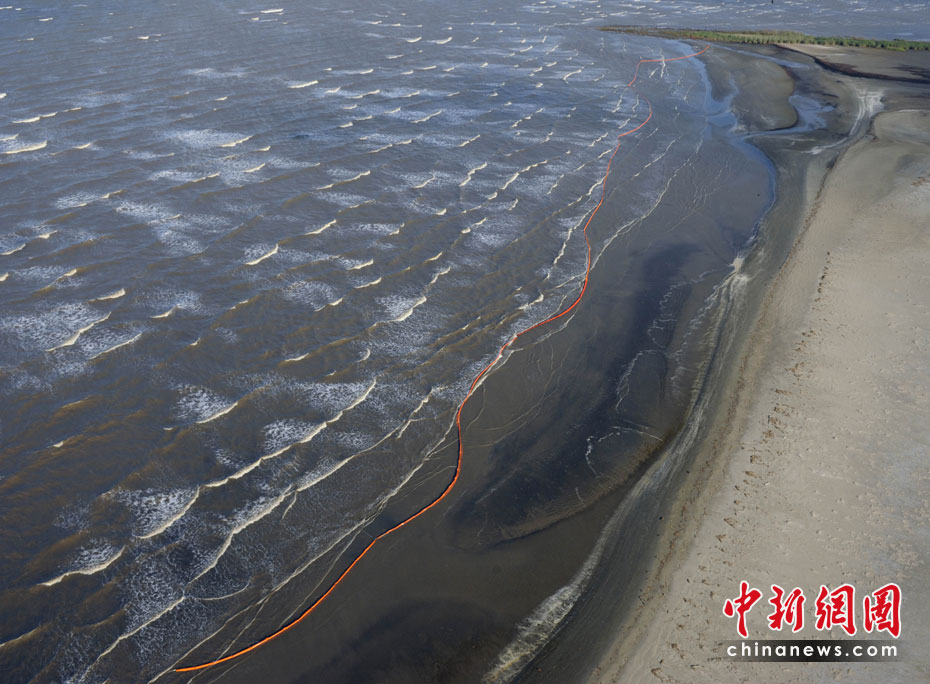 4月30日,在美國(guó)路易斯安那州海岸,為阻隔原油擴(kuò)散而設(shè)的護(hù)欄帶被海風(fēng)浪沖到岸邊。當(dāng)天,美國(guó)總統(tǒng)奧巴馬下令調(diào)查墨西哥灣石油鉆井平臺(tái)爆炸事件,以避免將來(lái)類似事件再次發(fā)生。平臺(tái)爆炸沉沒(méi)后泄漏的原油當(dāng)天已漂至美國(guó)沿岸。圖片來(lái)源:中國(guó)新聞網(wǎng)