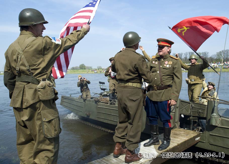 德國當地時間4月24日,演員身著二戰時期美蘇軍裝在德國托爾高南部易北河畔的一座小橋上重現當年的“會師”一幕。圖片來源:中國新聞網>>點擊觀看詳細內容