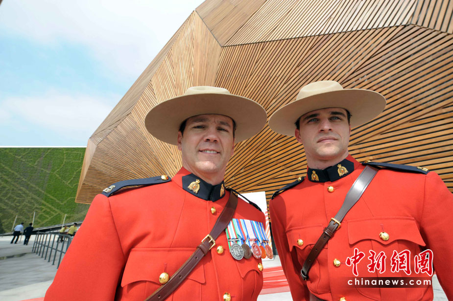 5月1日,上海世博會開幕第一天,兩名加拿大騎警在加拿大館前亮相,加拿大館于當日上午開館。中新社發 陳文 攝