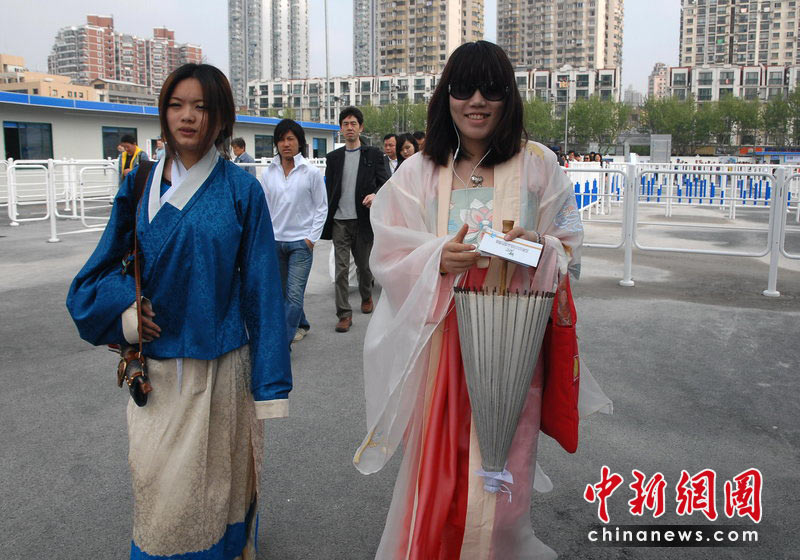 5月1日,上海世博會(huì)正式開園迎客,首批游客入園參觀。來自浙江大學(xué)城市學(xué)院的大學(xué)生,特地穿上漢服觀看中國(guó)上海2010年世博會(huì)。徐和德 攝