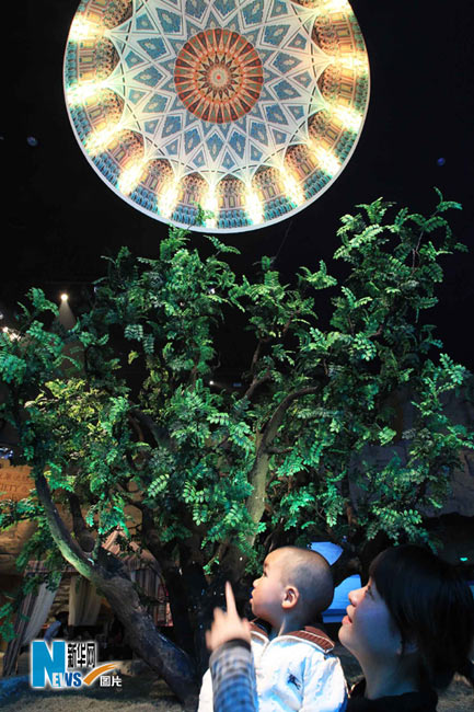 5月1日,上海世博會正式開園迎客,首批游客入園參觀。圖為游客在阿曼館內參觀。 李明放攝