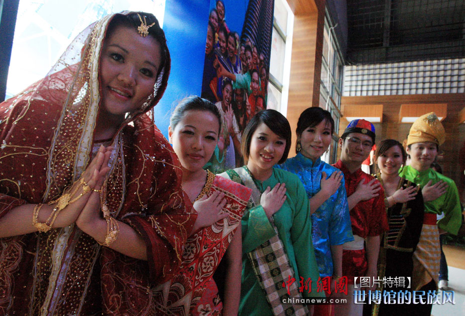 5月1日,上海世博會馬來西亞館開館,各式亮麗的民族服裝成為游客觀賞的一道美景。中新社發 潘索菲 攝