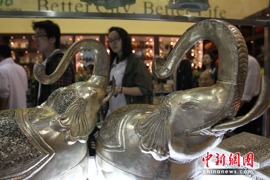 5月1日,觀眾在世博會柬埔寨館被精美的銀器吸引。中新社發 蘇丹 攝