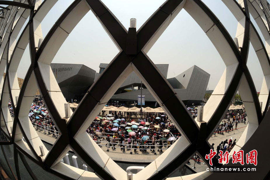 5月2日,上海世博園開園第二天迎來客流高峰。在正午的陽光下,從法國館的藝術格柵中眺望德國館,別有一番景觀。 中新社發 廖攀 攝