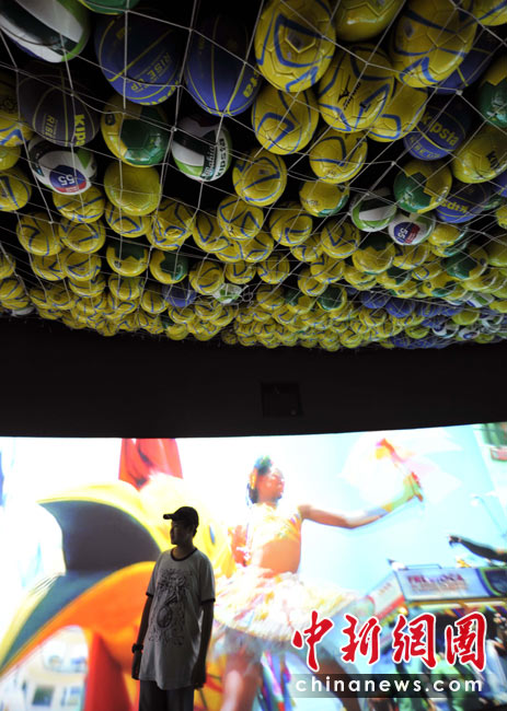 5月2日,上海世博園巴西館,一個小觀眾在播放著桑巴熱舞的環形屏幕前留影。這個放映廳的天花板是由幾千個足球組成,盡顯“桑巴王國”、“足球王國”的風采。 中新網記者 王紅綱 攝