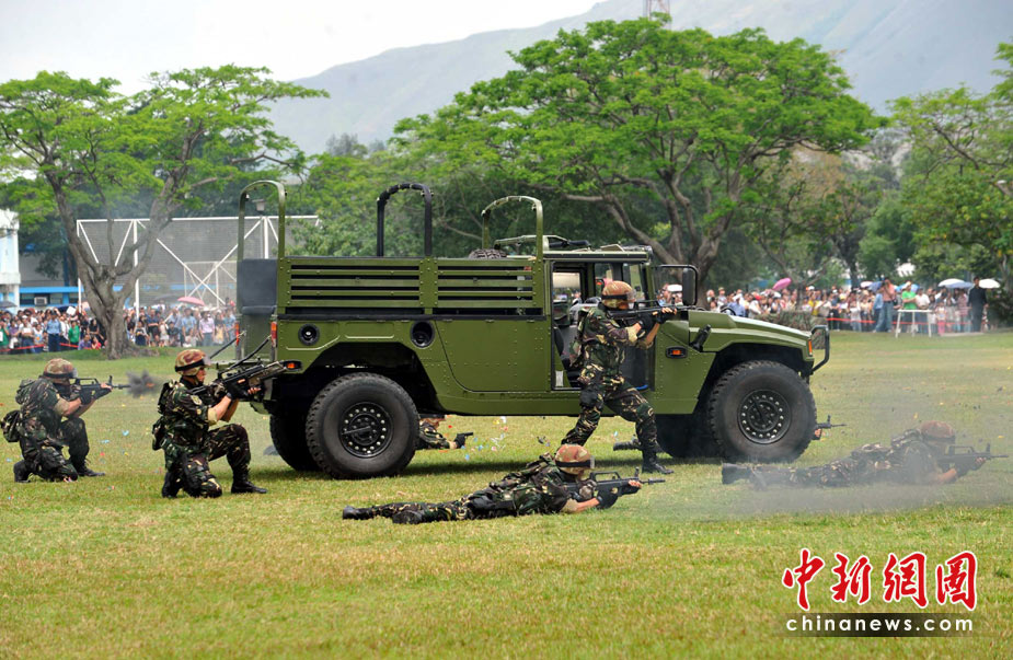 為慶祝“五一”國際勞動節,進一步增進與香港社會各界相互溝通與交流,中國人民解放軍駐香港部隊5月2日開放了石崗軍營。圖為駐港部隊“獵人戰斗”表演。 中新社發 鄧慶樂 攝