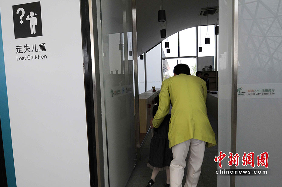 5月2日清晨,7歲的林姝彤小朋友剛跟著伯伯嬸嬸進入上海世博園,就在亂哄哄的人流中走丟了,志愿者把她領到走失兒童認領處。服務小姐在詢問她的姓名等關鍵詞之后,會立即廣播尋人啟示。結果,她很快就和親人團圓了。中新社記者 賈國榮 攝
