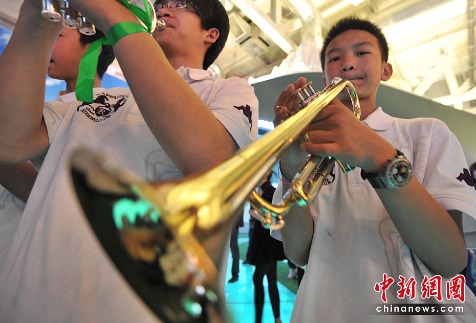 5月2日清晨,來自玉樹地震災(zāi)區(qū)結(jié)古鎮(zhèn)的藏族小樂手巴東珠,含著姐姐在地震中不幸遇難的悲痛心情,與小白楊中學(xué)生管弦樂團(tuán)來到上海世博會(huì),為中國(guó)青海館觀眾獻(xiàn)上一曲《在那遙遠(yuǎn)的地方》。他悲歡交融的情懷和演藝,感動(dòng)全場(chǎng)。巴東珠之前還是青海省人民醫(yī)院為地震傷員做藏語翻譯的志愿者。中新社記者 賈國(guó)榮 攝